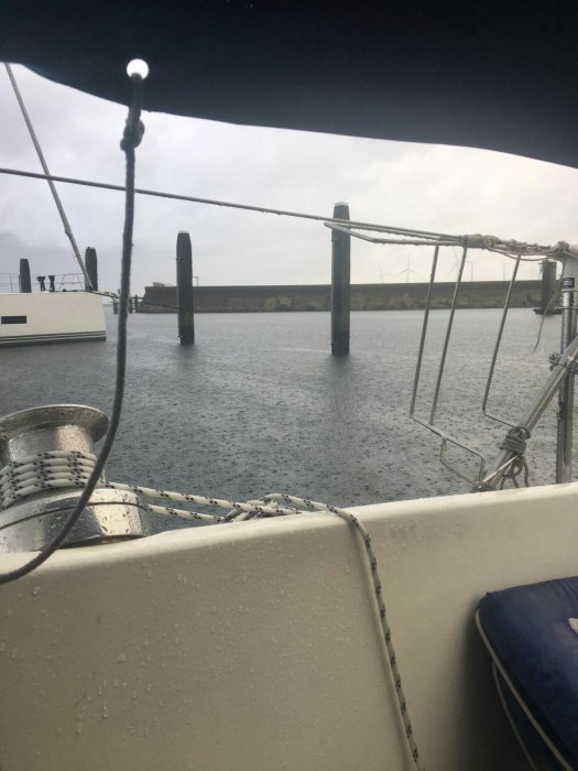 Nu ligger vi i en trygg och mysig hamn i Ostende och väntar ut kulingen och regnet och gör små jobb ombord (såsom att olja vindflöjeln –